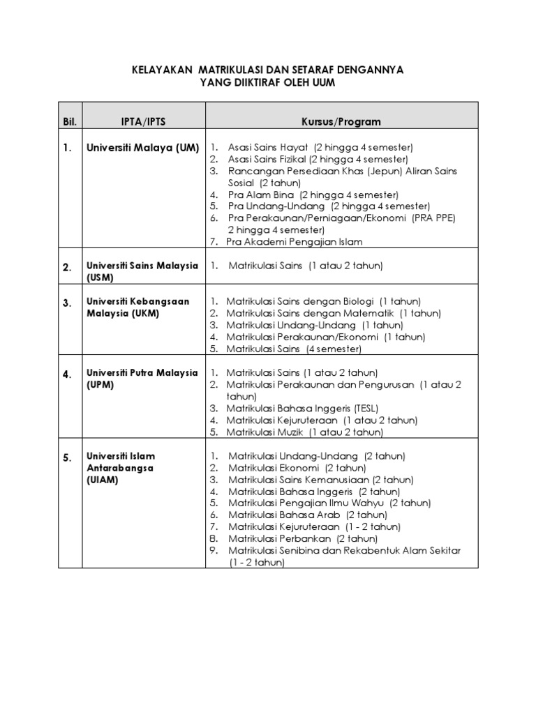 Terbuka kepada calon-calon yang berketurunan Melayu Pribumi Sabah Pribumi Sarawak dan Orang Asli Semenanjung sahaja. A plus kimia PI and math. Jurusan Perakaunan pula mengandungi mata pelajaran Ekonomi Perakaunan Pengurusan Perniagaan dan Matematik sepanjang pembelajaran Program Matrikulasi Kementerian Pelajaran Malaysia.